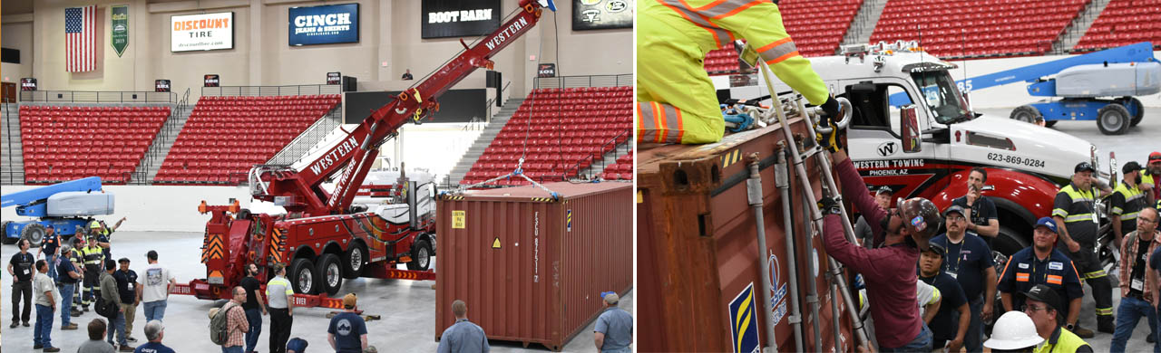 HANDS-ON TRAINING – Inside the climate-controlled South Point Arena, top trainers from ERSCA and WreckMaster go through the paces of various recovery techniques to increase a towman’s skill set while on the job.